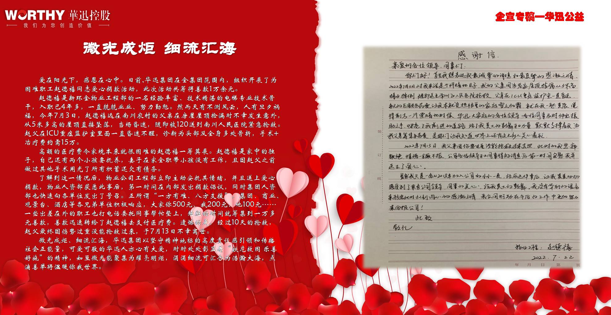 華迅自1998年成立以來,一直堅(jiān)持慈善公益,從未間斷。不忘初心,時(shí)刻踐行“永續(xù)經(jīng)營(yíng),回報(bào)社會(huì)”的經(jīng)營(yíng)理念,累計(jì)捐款逾1000萬元。其中,在民建“善德基金”認(rèn)捐100萬;定向捐助萬州特殊教育中心10萬;在重慶市慈善總會(huì)設(shè)立“華迅-AI”基金,認(rèn)捐500萬;在“綠化長(zhǎng)江 重慶行動(dòng)”大型公益活動(dòng)中,為母親河植樹造林捐款100萬;設(shè)立“華迅捐資助學(xué)基金”200萬等,為慈善建設(shè)持續(xù)貢獻(xiàn)力量。