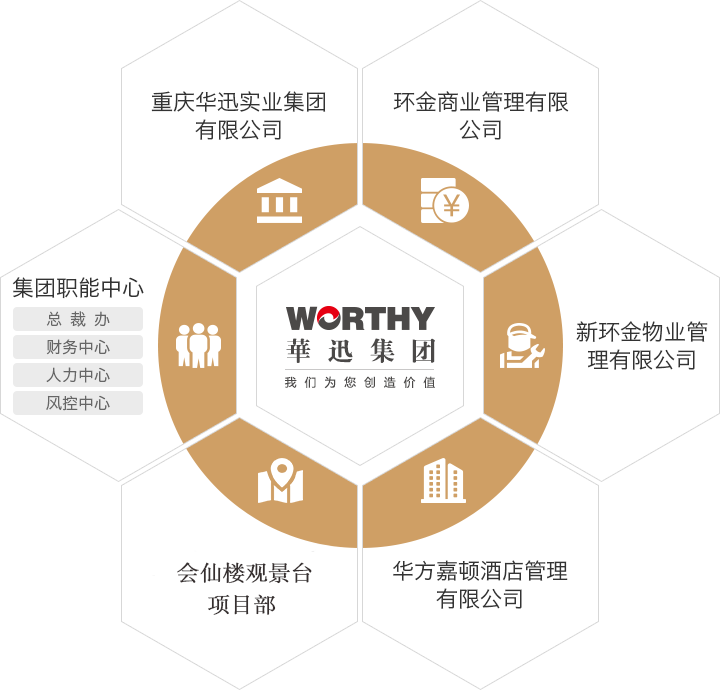 集團(tuán)在快速發(fā)展過程中,不斷優(yōu)化集團(tuán)內(nèi)部組織管理機(jī)制,建立現(xiàn)代企業(yè)制度,堅(jiān)持創(chuàng)新理念和科學(xué)發(fā)展觀。通過高效的資源整合,建立了一整套科學(xué)、嚴(yán)謹(jǐn)、高效的企業(yè)運(yùn)營(yíng)管理體系。為兼顧各業(yè)態(tài)公司的行業(yè)特點(diǎn)與經(jīng)營(yíng)需要,集團(tuán)在組織架構(gòu)上采取“職能集中,業(yè)務(wù)授權(quán)”的原則,下設(shè)總裁辦公室、人力資源中心、財(cái)務(wù)中心、風(fēng)控中心四個(gè)職能中心,及重慶華迅實(shí)業(yè)集團(tuán)有限公司、環(huán)金商業(yè)管理有限公司、新環(huán)金物業(yè)管理有限公司、華方嘉頓酒店管理有限公司四個(gè)分子公司和會(huì)仙樓觀景臺(tái)項(xiàng)目部。