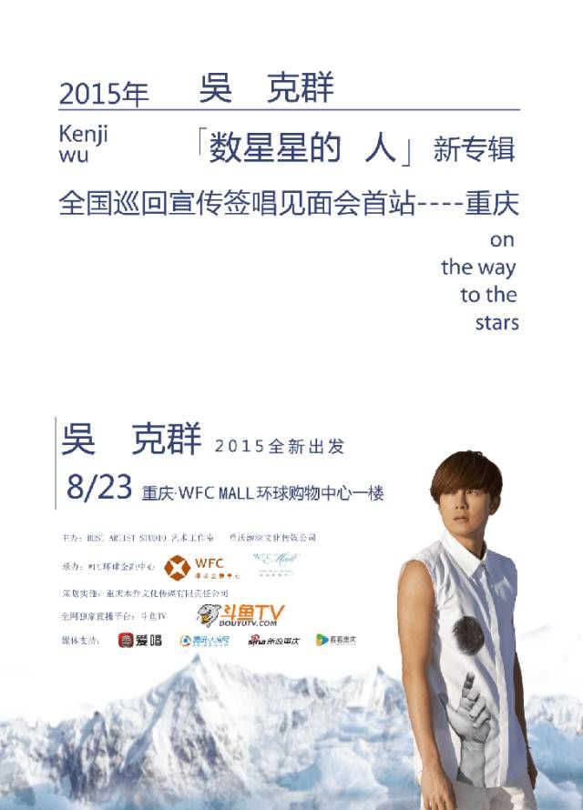 8月23日 下午15:00搖滾詩人吳克羣將攜2015年全新專輯《數(shù)星星的人》來到WFC MALL環(huán)球購物中心舉行全國巡回宣傳簽唱會(huì),WFC MALL環(huán)球購物中心作為西南地標(biāo),此次更是作為宣傳簽唱會(huì)首站,內(nèi)場名額和“好白菜”同樣可貴,走心的你肯定是內(nèi)場名額&“好白菜”兩手都要抓的,加油咯~