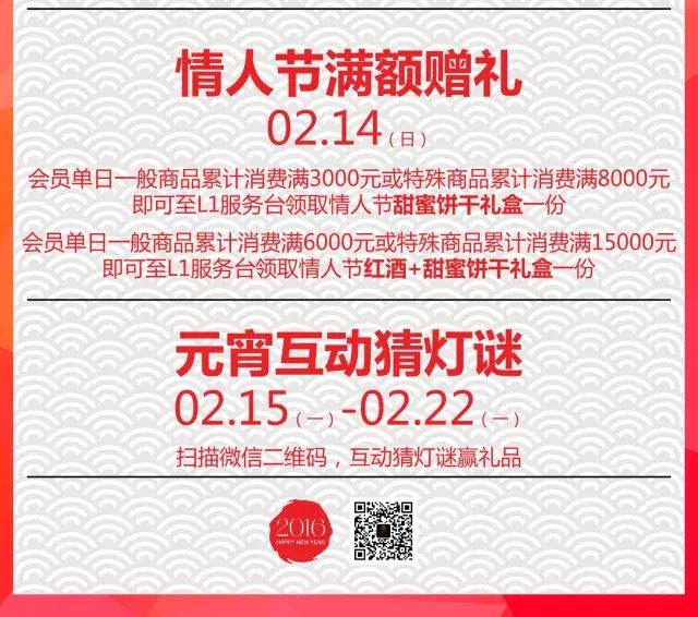 福袋!刷卡禮!情人節(jié)滿額贈(zèng)禮!還有元宵節(jié)猜燈謎大會(huì),熱熱鬧鬧,鑼鼓齊鳴,咚咚咚鏘,咚咚咚鏘,迎接新年啦~