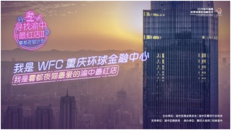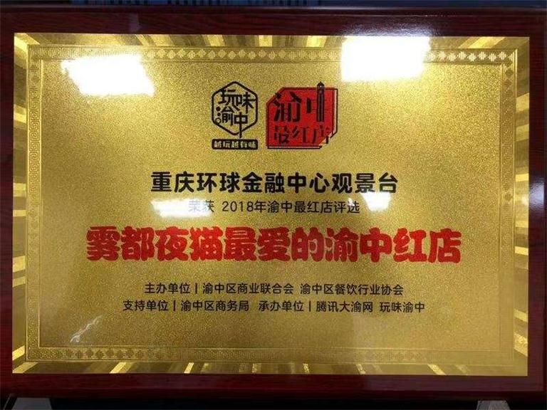 【觀景臺(tái)/企劃部】2018年9月13日至11月26日期間,由渝中區(qū)商業(yè)聯(lián)合會(huì)、渝中區(qū)餐飲行業(yè)協(xié)會(huì)主辦,渝中區(qū)商務(wù)局指導(dǎo),騰訊大渝網(wǎng)、玩味渝中承辦的“尋找渝中最紅店Ⅱ·霧都夜貓計(jì)劃”評(píng)選活動(dòng)中,重慶環(huán)球金融中心觀景臺(tái)榮獲“最紅渝中店20強(qiáng)”稱號(hào)。
