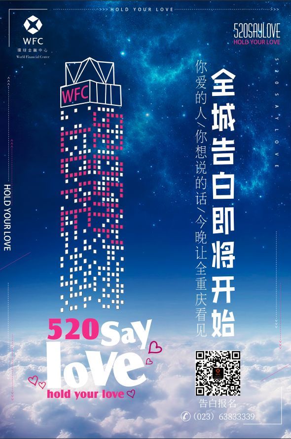 燈幕告白活動:5月20日19:00--22:00于重慶環(huán)球金融中心樓體巨屏燈幕播放征集的告白留言。