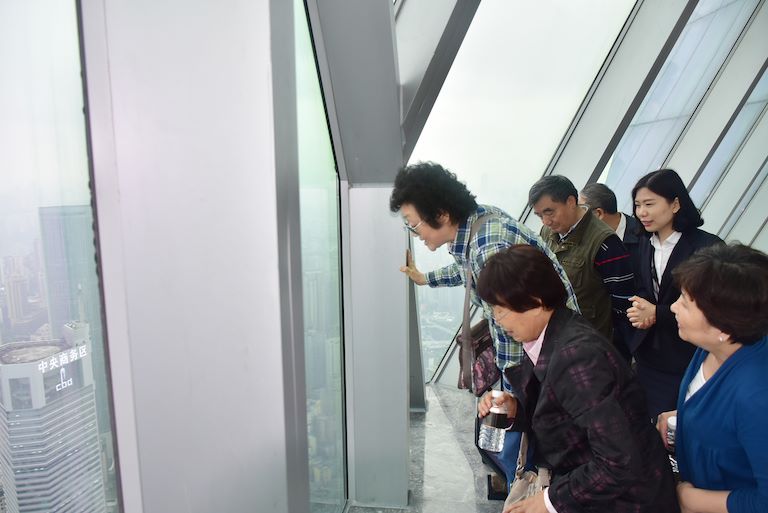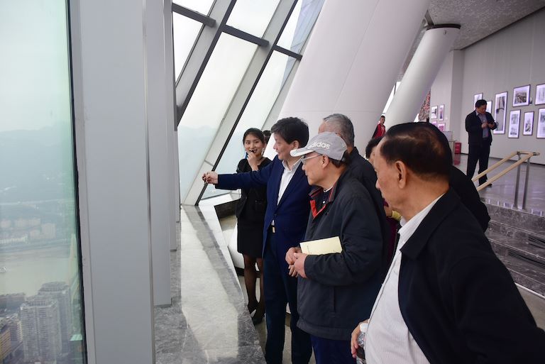 老同志們一行于下午5時許在市委常委、組織部長胡文容,市委組織部副部長、老干部局長陳全,渝中區(qū)區(qū)委書記黃玉林,區(qū)委常委、組織部部長王志宏等領導的陪同下陸續(xù)達到WFC。隨后,老同志們在工作人員的引導下陸續(xù)乘坐高速電梯抵達WFC觀景臺。