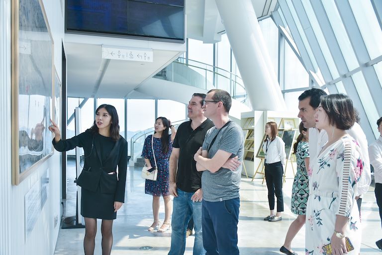 蒙塞奇部長(zhǎng)一行在高總及觀景臺(tái)講解員的陪同講解下,詳細(xì)參觀了位于WFC觀景臺(tái)的主題展區(qū),并在《重慶府治全圖》前感受母城文化的厚重,在觀景臺(tái)上俯瞰解放碑、江北嘴、南濱路感受重慶經(jīng)濟(jì)社會(huì)的快速發(fā)展,從不一樣的角度體會(huì)山水之城、美麗之地的真實(shí)內(nèi)涵。